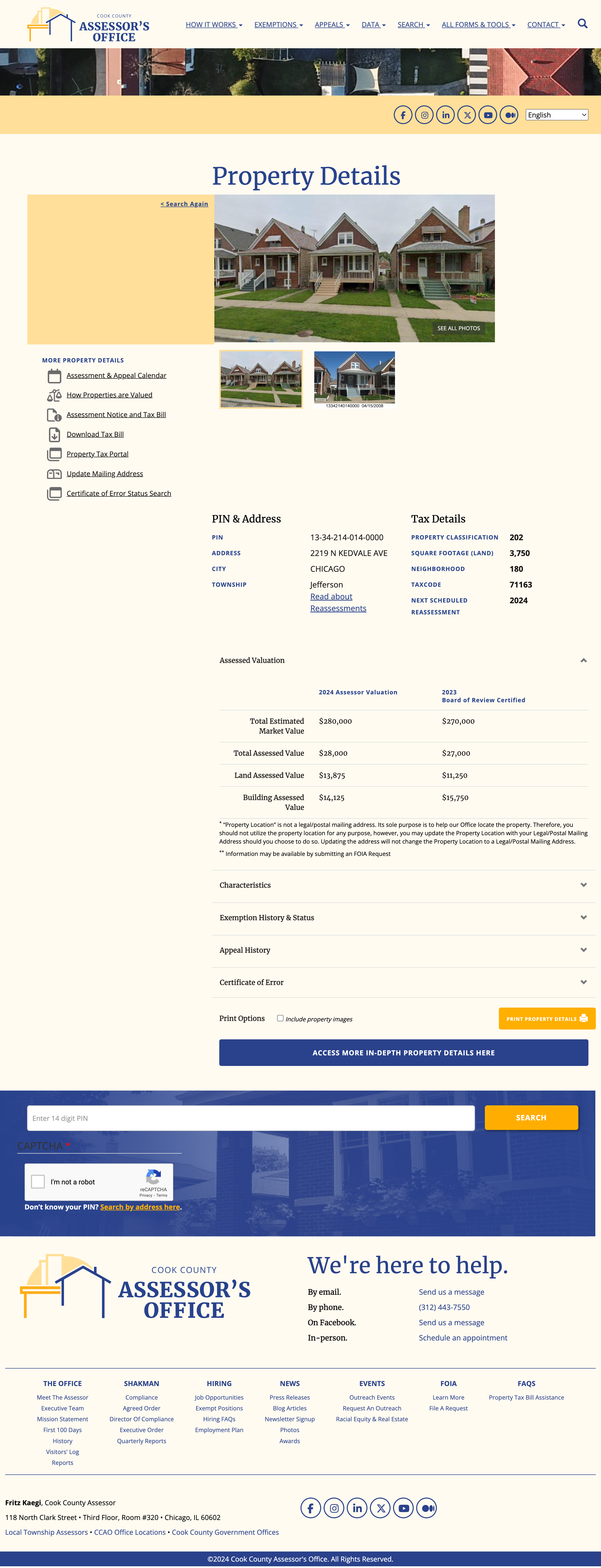 Online Assessment: If you do not have a paper form and you've gotten your PIN, go to the http://www.cookcountyassessor.com and navigate to Search > Property > Property Search by PIN. Once you enter your PIN and the random security code to make sure you are not a robot and submit the form, you will see all your personal data and property information. You will see your new 2024 assessed value.